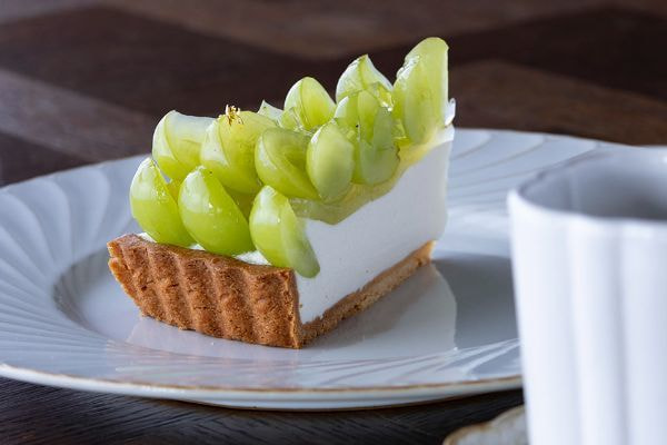 うちやま果樹園のシャインマスカット〈翡翠〉のタルト。翡翠のフレッシュな食感と濃厚な甘さをマスカルポーネクリームが包む夏ならではの味わい。