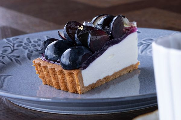 深い夜の色をした葡萄のタルト。ほんの少しワインを垂らしたマスカルポーネに濃厚な甘さと香り高い黒葡萄。果汁のゼリーには、金に輝く星を。